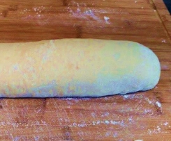 Mit Hilfe der Dauerbackfolie den Hefeteig von der Längsseite her aufrollen und etwa 3-4cm dicke Streifen schneiden...