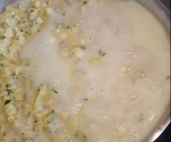 Portionsweise mit dem Spätzlereiber in das kochende Wasser reiben und aufquellen lassen.