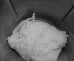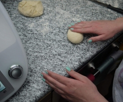 "Mixtopf geschlossen" auf bemehlte Arbeitsfläche geben und vorsichtig mit der Hand einmehlen und zu einer Kugel formen