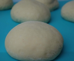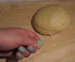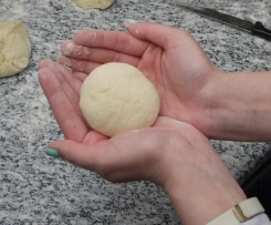Teig mit einem scharfen Messer in 8 Stücke teilen und vorsichtig zu kleinen Knödeln formen, dabei mit Mehl bestreuen, sodass der Teig nicht an den Händen kleben bleibt