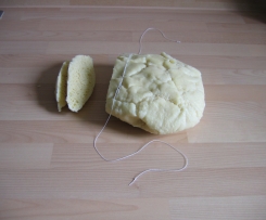 Einen Knödel ins Wasser geben, Wärmezufuhr verringern Knödel von jeder Seite 8-10 min. im zugedeckten Topf ziehen lassen. Danach Knödel mit Faden in Scheiben schneiden (siehe Bilder).