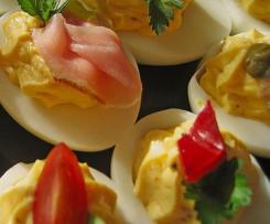 5. Die Eier auf einen Teller verteilen und mit Creme oben drauf legen. Zum Schluss mit dem klein gehackten Schnittlauch dekorieren.
