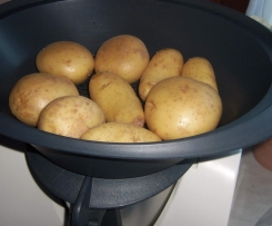 "Mixtopf geschlossen" geben und Deckel auf , und dann die Kaetoffeln mit der Schale in denVaroma-behälter geben .und bei 40Min ./ Varoma Stufe 1./ dämpfen .