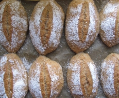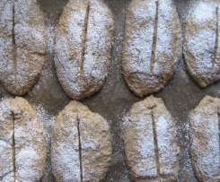 - Die Teiglinge während des Vorheizens abgedeckt noch mal gehen lassen. Dann mit einem Sägemesser der Länge nach ca. 0,5 cm tief einschneiden, dabei die Spitzen aussparen (nicht drücken, nur schneiden).