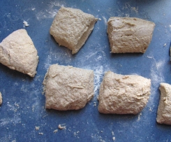 - Den Teig auf einer sehr gut bemehlten Arbeitsfläche kurz von Hand durchkneten, in 8 Stücke teilen und diese kurz ruhen lassen (war bei mir eine sehr klebrige Angelegenheit).