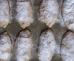 - Die Stücke zu Rollen formen, diese an den Enden spitz formen und etwas flach drücken. Auf ein mit Backpapier belegtes Blech legen und mit Stärkemehl besieben.