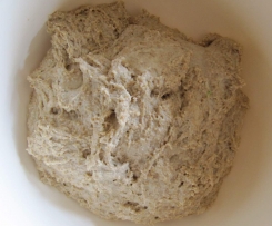 " Modus „Teig kneten“" und umfüllen. Der Teig ist ziemlich klebrig. - Den Teig an einem mäßig warmen Ort ca. 1 Stunde abgedeckt gehen lassen, bis er sich in etwa verdoppelt hat.