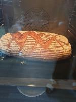 Im Backofen auf das heisse Blech mit Backpapier bedeckt den Teig aus dem Körbchen stürzen und ca. 10Min bei 250° backen, dann 50Min bei 200° fertig backen,