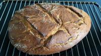 Das Brot auf einem gelochten antihaftbeschichtetem Backblech ohne Abdeckung gebacken. Den Brotlaib mit den Händen geformt und mit einem Messer geritzt.