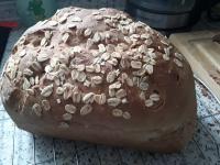 Brot mit etwas Wasser befeuchten, kreuzweise einritzen und die Haferflocken darauf verteilen.