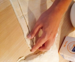Den Teig rechteckig ausrollen und mit einem Pizzaschneider in längliche Stücke schneiden.