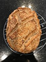 Teig entnehmen und auf einer bemehlten Arbeitsfläche, ein paar mal, wie üblich falten. Zu einem Brotlaib formen und abgedeckt ca. 45 Min. gehen lassen.
