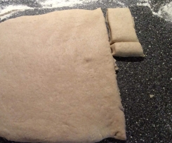 " Modus „Teig kneten“" kneten. In eine Schüssel umfüllen und abgedeckt an einem warmen Ort ca. 45 Min. gehen lassen.Dann Teig mit den Händen kurz etwas durchneten und auf der bemehlten Arbeitsfläche mit dem Nudelholz zu einem ca. 1 cm dicken Rechteck ausrollen.