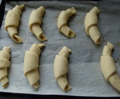 Den Teig halbieren und jeweils dünn und rund auswellen. Mit dem Pizzarädchen "Kuchenstücke" schneiden und diese von der breiten Seite zur Spitze hin aufrollen. Die Spitze sollte sich dann unter dem Hörnchen befinden wenn es aufs Blech kommt (sonst rollt sich das Hörnchen auf).