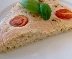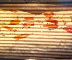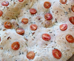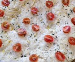 Dann mit dem Knoblauchöl bestreichen, Rosmarin drüber streuen und die halbierten Kirschtomaten leicht eindrücken. Mit Meersalz bestreuen.