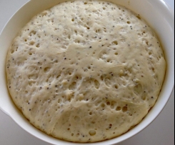 Teig mit Hilfe von Mehl aus einem mit Bachpapier belegten Blech ca. 1cm dick ausbreiten und nochmal abgedeckt 20 Minuten gehn lassen.