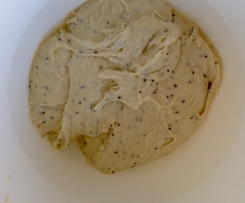Restliches Olivenöl, Mehl, Trockenhefe, Salz, Ahornsirup, Chiagel und Wasser zu dem Knoblauchöl in den