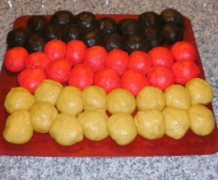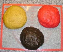 Mit geölten Händen aus dem Teig einer jeden Farbe 16 Kugeln a 45g drehen
