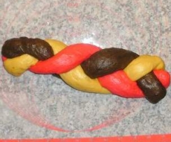 Aus der Teigresten der einzelnen Farben dünne Stränge rollen zud zu einem kl. Zopf flechten