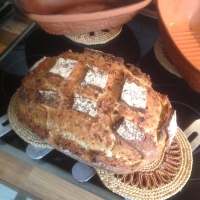 und Brotteig in den Römertopf einfüllen. Oberseite längst und quer einritzen, damit Kruste schön wird und Brot nicht aufplatzt. Der Deckel kann bis zum Ende der Backzeit auf dem Römertopf bleiben!!