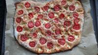 Ich habe es mit frischen und mit getrockneten Tomaten aus dem Glas belegt. Es waren leider erst 5 Tomaten reif. Bei meinem Ofen hätten max.23 Minuten gereicht, so ist es etwas zu hart geworden. Dann wird es beim nächsten Mal optimal.