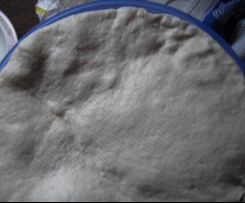 Am nächsten morgen ein Gärkörbchen, oder eine flache Schüssel (bei mir musste der Bräter herhalten) mit einem Tuch auslegen und leicht mit Mehl bestäuben.