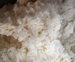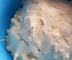 Dann 2,5 min/[corn] zu einem zähen Teig verarbeiten, der dann sehr homogen aussieht.