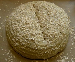 Dann den Teig auf ein mit Backpapier ausgelegte Backblech stürzen, mit Milch einpinseln und mit Haferflocken bestreuen. Den Backofen auf Ober-/Unterhitze 240° vorheizen und das Backblech auf die unterste Schiene einschieben. Mit einer Blumenspitze Wasser an die Backofenwände sprühen, oder ca. einen 1/2 Messbecher (TM) Wasser im Schwall auf den Backofenboden schütten. (Schwaden). Nach ca. 10 min auf 190° zurückdrehen und das Brot weitere 50 min fertig backen.