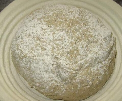 Den Teig wieder auf eine bemehlte Arbeitsfläche geben und wieder mit Teigkarte und Mehl in Form wirken. Keine Angst es darf ruhig ordentlich Mehl genommen werden. Dann den Teig in ein bemehltes Gärkörbchen geben, mit Mehl bestäuben und weitere 20 min ruhen lassen. Er wird noch einmal gut aufgehen.