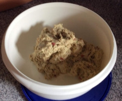 "Mixtopf geschlossen" , umfüllen in eine Schlüssel ( ich nehme immer meine " Pengschüssel von Tupper, die ist super) und 1 Std gehen lassen.Nach der Stunde den Teig auf der Arbeitfläche 10 x falten und zum Schluss zum Laib formen. Mannbraucht eigentlich auch kein Mehl dazu...Teig lässt sich prima verarbeiten