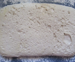 Die Arbeitsfläche mit Mehl bestäuben. Teig an den Dosenkanten mit einer Teigkarte lockern und auf die Arbeitsfläche stürzen.