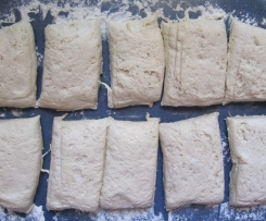 Mit der Teigkarte längs halbieren und in je fünf Stücke teilen.