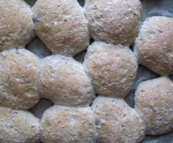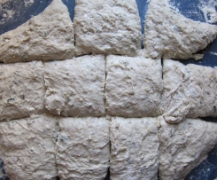Nach der Gehzeit den Teig wieder auf die gut bemehlte Arbeitsfläche geben und leicht flach drücken und zu einem Rechteck ziehen. Ich habe den Teig etwas zu flach gedrückt, dadurch waren die Brötchen nicht so hoch. Den Teig mit einer Teigkarte in ca. 10 Stücke teilen ....