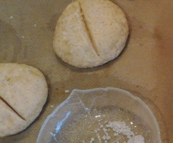 Teig auf die bemehlte Arbeitsfläche geben und 10 (ca. 105g) oder 13 (ca. 80g) Rohlinge abstechen und einzeln nochmal etwas kneten. Zu einer glatten Kugel rollen und mit der Hand platt drücken.
