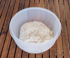 Teig in eine Schüssel umfüllen, abgedeckt 12-16 Stunden bei Raumtemperatur stehen lassen, zwischendurch Teig 2-3 Mal dehnen und falten.