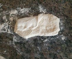 Teigstück etwas auseinanderziehen, von oben nach unten klappen und nochmal von oben nach unten klappen, etwas auseinanderrollen ohne fest zu drücken. Es gibt dazu verschiedene Videos die man sich anschauen kann.