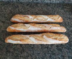 Teig in eine Schüssel umfüllen, abgedeckt ca. 1 Stunde bei Raumtemperatur stehen lassen zwischendurch 2x falten. Anschließend den Teig 1 bis 4 Tage im Kühlschrank gehen lassen. - Teig auf eine leicht bemehlte Arbeitsfläche geben, in 3 gleichgroße Stücke teilen, Baguettes formen. Auf ein Baguetteblech geben, abgedeckt gut 1 bis 2 Stunden bei Raumtemperatur ruhen lassen oder 30 Min. im Backofen bei 30°C gehen lassen.