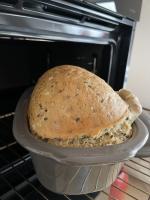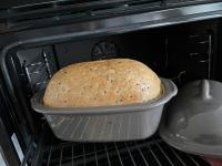 Das Brot in den Ofen schieben. Sofort eine Tasse Wasser in die Form auf den Ofenboden gießen.