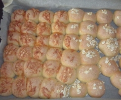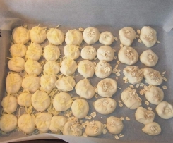 - Anschließend die Teigkugeln nach Belieben belegen, also z.B. mit geriebenem Köse (z.B. Gratinkäse) oder diversen Körnern. Man kann die Kugeln vorher mit Wasser besprühen oder aber die Beläge einfach ein bisschen eindrücken.