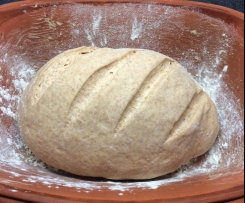 Den Teig auf die bemehlte Arbeitsfläche geben und 10 mal falten. In den Römer legen und oben einschneiden. Deckel drauf und noch mal 20 min gehen lassen. Ich habe ihn wieder unter die Bettdecke gestellt.