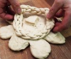 " Modus „Teig kneten“" zu einem glatten Teigverarbeiten. Danach Teig aus dem TM nehmen, klebt nicht fest, Teig an einem warmen Ort zur doppelten Größe gehen lassen.10 gleiche Teile aus dem Teig stechen und Sterne daraus formen siehe foto oder etwas flach drücken, sodass es einem Hut gleicht, nach außen etwas schmäler werden. Dann 6 Sternenzacken einschneiden und nach unten umklappen und dann aufs Backblech legen. Mit einem scharfen Messer eine Raute oben einschneiden.