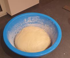 In dieser Zeit eine große Schüssel und die Arbeitsplatte leicht bemehlen. - Teig auf die vorbereitete Arbeitsplatte geben, zu einer Kugel formen und in die Schüssel geben. Diese mit Frischhaltefolie oder einem Handtuch abdecken, dann für 2 Stunden an einem warmen Ort gehen lassen.