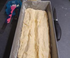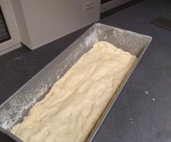 Zum Ende der Gehzeit den Backofen auf 180-200°C (jeder Backofen heizt anders) vorheizen. - Den Teig in die vorbereitete Backform geben und etwas andrücken.