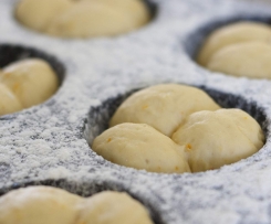 3. 3 der Kugeln kommen jeweils in eine geffetete und bemehlte Mulde eines Muffinblechs. So bis keine Kugeln mehr über sind.