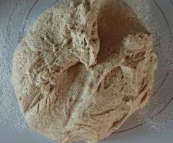 - Den Teig auf eine bemehlte Arbeitsfläche mit Hilfe des Spatels geben und mehrmals falten, dann