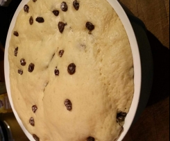 "Mixtopf geschlossen" in eine entsprechend große Schüssel schütten. Verbleibende Teigreste mit der "Turboeinstellung" lösen und zugeben.5) Die Rosinen in ein Sieb schütten, damit das Wasser abläuft. Vorsichtig ausdrücken und auf ein Küchenkrepp geben. Mit einem 2. Krepp so gut es geht trockentupfen und mit Mehl bestäuben (etwa 1 kleine Tasse voll reicht), alle Rosinen schön darin wenden, damit jede Rosine etwas abbekommt. Restmehl entsorgen und die bemehlten Rosinen vorsichtig unter den Teig kneten. Teig abdecken und an einem warmen Ort ca. 45- 60 min. gehen lassen, er sollte sich verdoppeln.