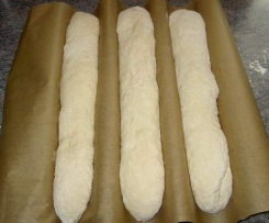 Die Teiglinge auf der Arbeitsplatte solange rollen bis sie ca. 30-40cm lang sind. Die 3 Baguette dann auf ein Baquetteblech oder ein normales Blech legen und noch einmal mit einem Tuch abgedeckt 45min gehen lassen.