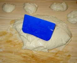 Am nächsten Morgen dann den Teig, der hat sich verdoppelt, auf ein Brett stürzen und mit nassen Händen und einer nassen Teigkarte 10 Teiglinge abstechen. Die Teiglinge ca. 15 min entspannen lassen.