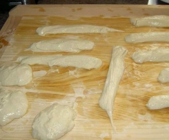 Die Teiglinge mit nassen Händen in die Länge ziehen und etwas gedreht auf ein mit Backpapier belegtes Backblech legen.