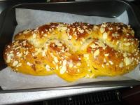 " Modus „Teig kneten“" kneten und an einem warmen Ort zugedeckt etwa 1 Stunde gehen lassen. - Aus drei Teigsträngen einen Zopf flechten, auf ein gefettetes Backblech legen, mit Eigelb bepinseln und mit Hagelzucker und Mandelblättchen bestreuen.